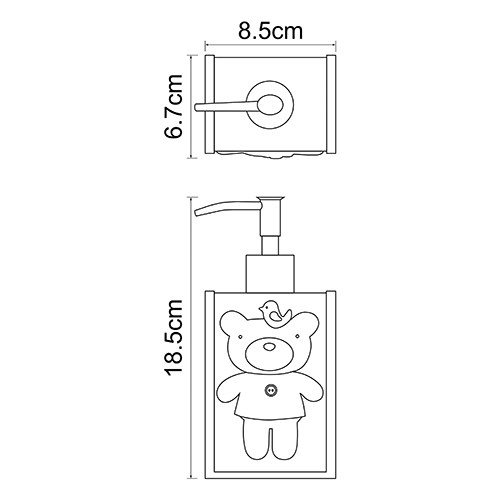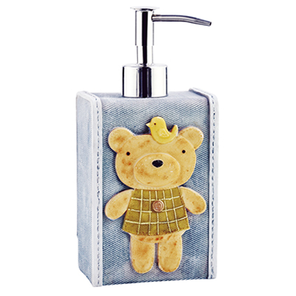 Сине-серый дозатор для жидкого мыла WasserKRAFT Lossa K-3499 украшен симпатичным медвежонком и декоративной прострочкой. Задняя часть дозатора оформлена небольшими пуговками.