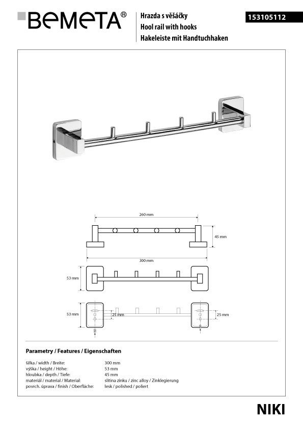 Крючок для полотенец Bemeta Niki 153105112 планка на 4 крючка в ванную комнату.