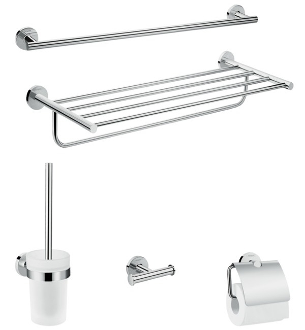 В комплекте поставки: ершик для унитаза 41722000, держатель туалетной бумаги 41723000, полка для полотенец с держателем 41720000, полотенцедержатель 41716000, двойной крючок 41725000.