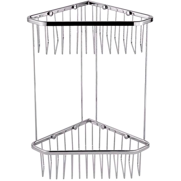 Угловая полка корзина Aquanet 8191 199904 угловая словно соткана из фигурно изогнутых железных стержней, закрепленных на треугольной основе. Места для размещения емкостей два. Они установлены друг под другом. Настенные крепления скрыты за хромированными заглушками.
