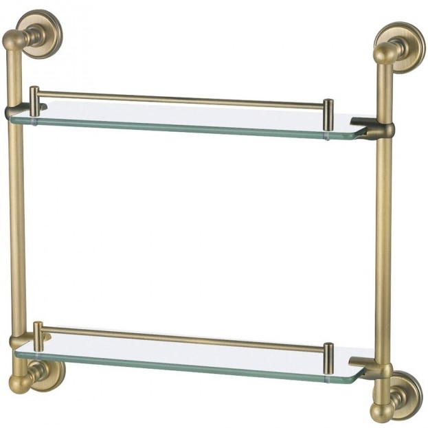 Двойная полочка Aquanet 4652 00189289 выполнена из латуни окрашенной в золотой цвет. Латунь обеспечивает прочность и высокую устойчивость к коррозии, поэтому модели из данного материала можно использовать в помещениях с повышенной влажностью. Массивные штанги соединены между собой, а на них установлены держатели для стеклянных полочек длиной 43 см. Золотые борты играют роль ограничителей для лежащих на полочках предметов. Крепление к стене спроектировано таким образом, чтобы крепежные элементы были скрыты.