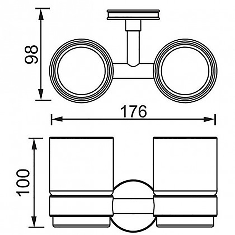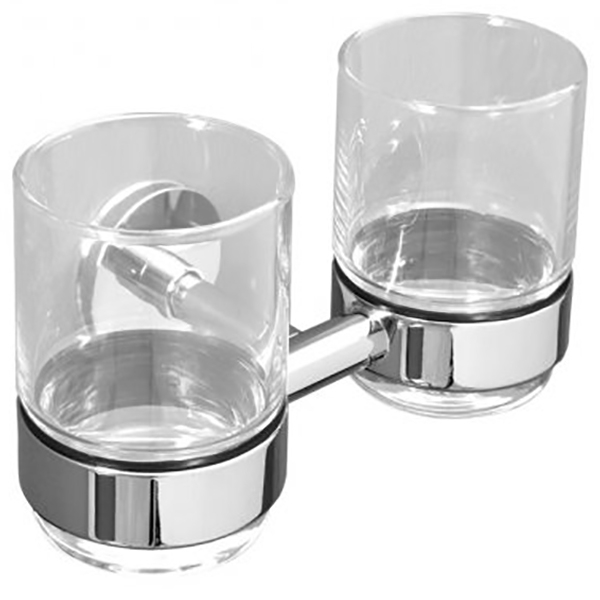 Двойной стакан Aquanet 6384D 202125 для зубных щеток и пасты, держатели для которых выполнены в виде широких колец из латуни. Соединенные вместе, эти кольца крепятся к блоку, в котором скрыты элементы настенного крепежа.Стаканы выполнены из прозрачного стекла.
