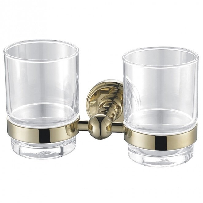 Двойной стакан Aquanet 4684D 00189283 выполнен из латуни в золотом цвете. Яркие кольца для емкости, на эффектном шаре, держит два стакана из прозрачного стекла. Декоративная деталь прячет в себе все надежные крепежи аксессуара, скрыв их от глаз.