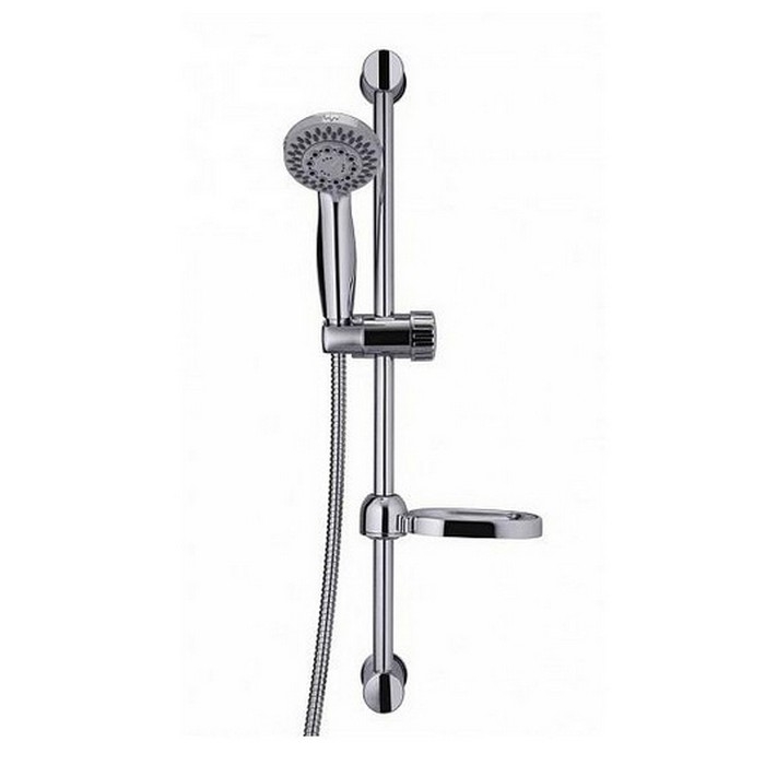Душевой комплект в цвете хром. Держатель лейки регулируется по высоте, полочка для мыла так же крепится к стойке. Современный дизайн конструкции подойдет для любой ванной комнаты в современном стиле, лаконично впишется в интерьер. Качественные материалы, которые используются в производстве смесителей, обеспечивают исправную работу на протяжении всего срока службы. Поверхность смесителя приятна на ощупь, такой эффект достигается тщательной полировкой всего корпуса. Материалы устойчивы к коррозии и перепадам температур.