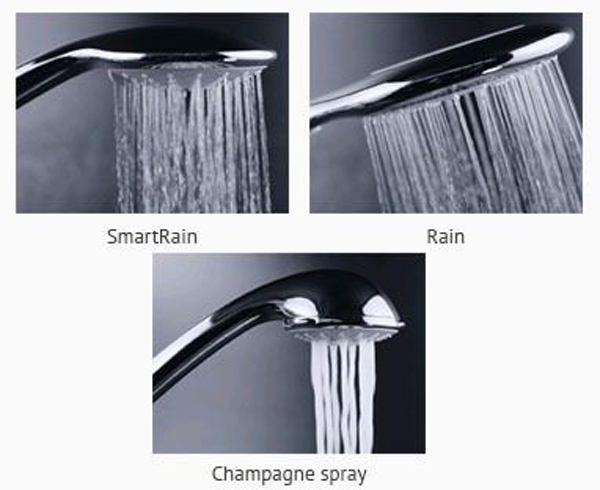 - Ручной душ на три вида струи: Rain (дождь), Champagne spray (мягкая), SmartRain (дождь эконом).