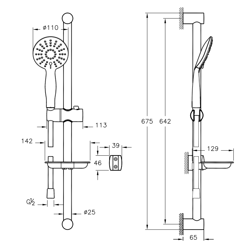 В комплекте поставки: ручной душ, душевая штанга с мыльницей, настенный держатель лейки, шланг.