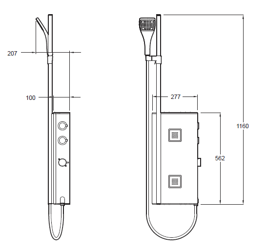 - 2 поворотные душевые форсунки на панели для гидромассажа спины.