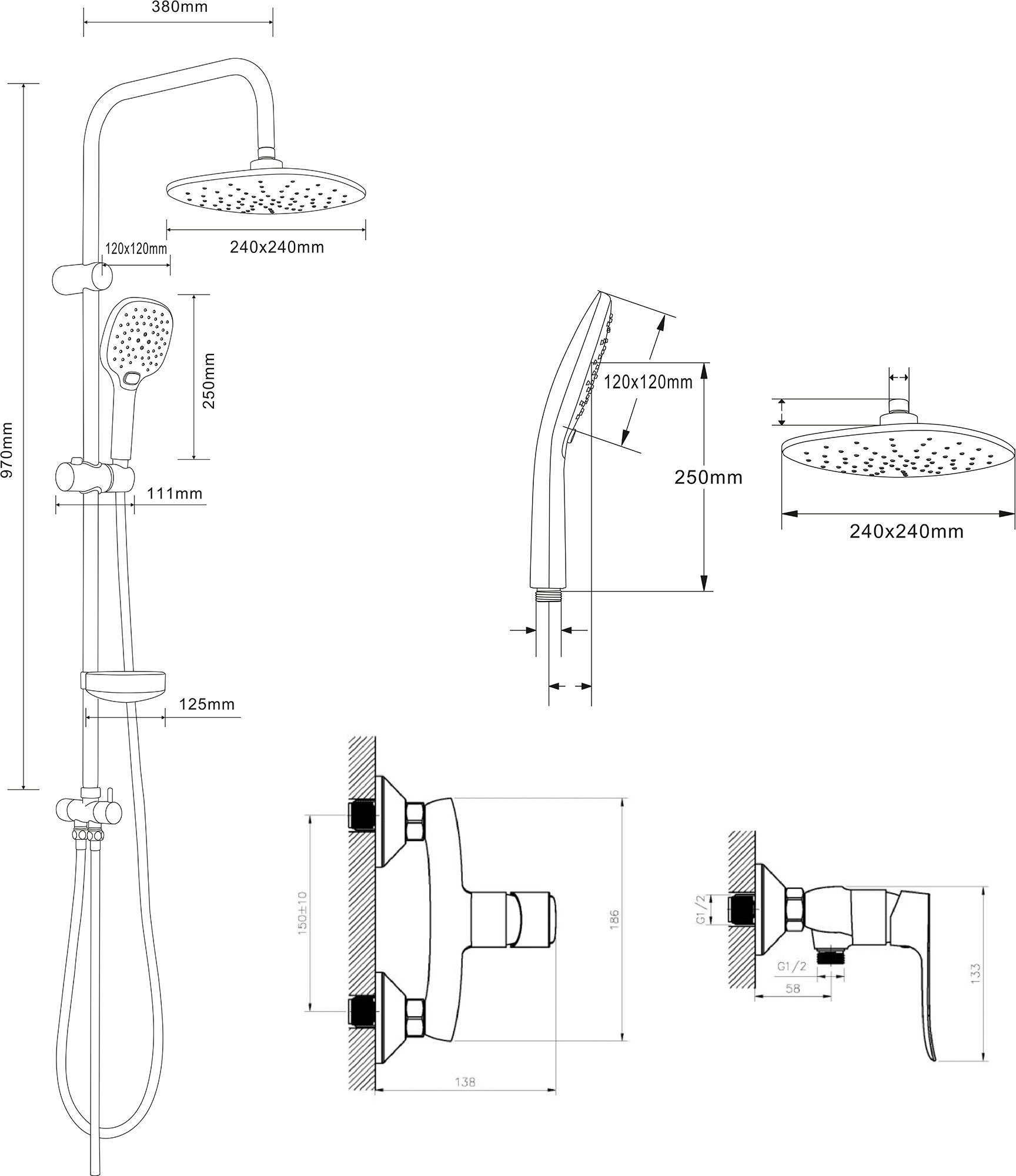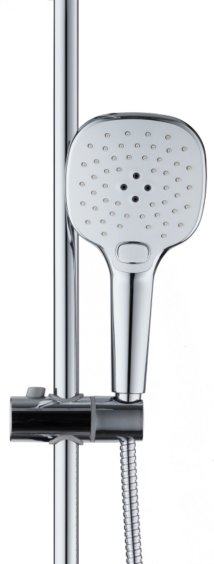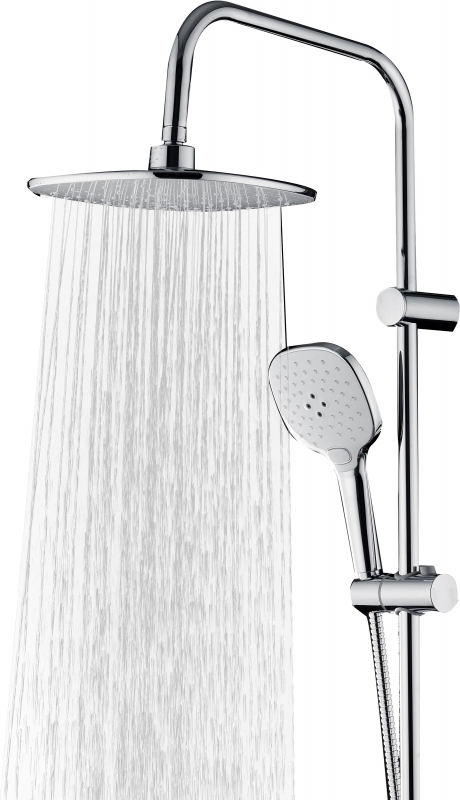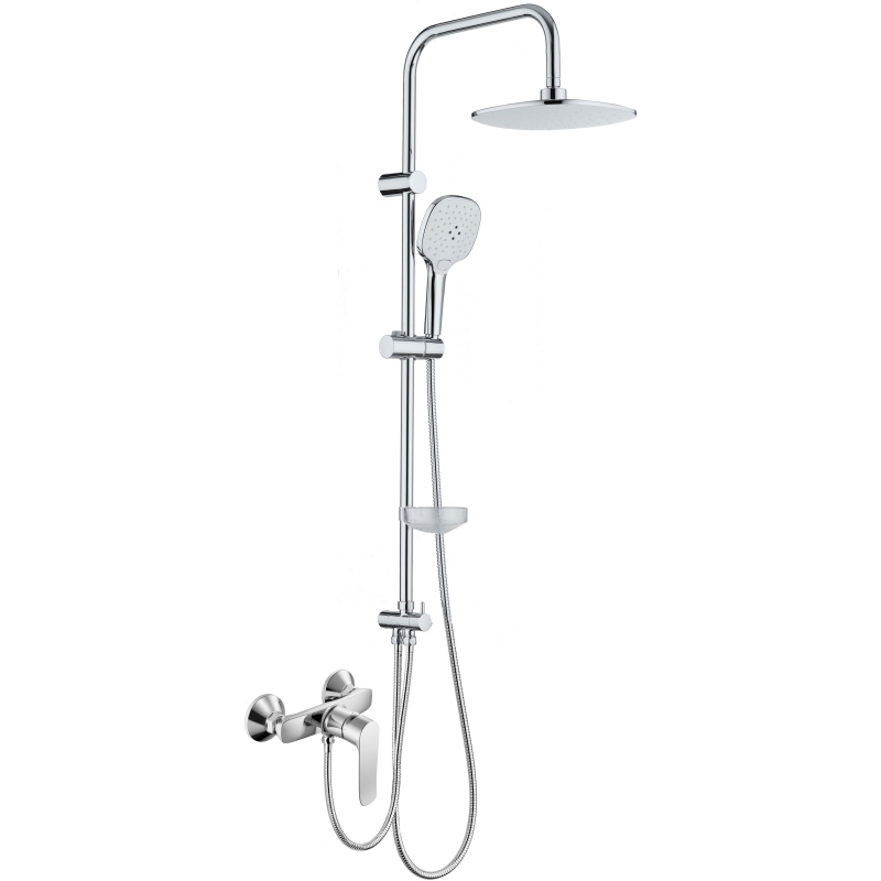 В комплекте поставки: верхний душ, смеситель, ручная лейка, шланг, держатель, мыльница, штанга.