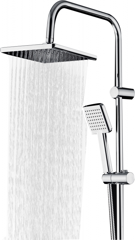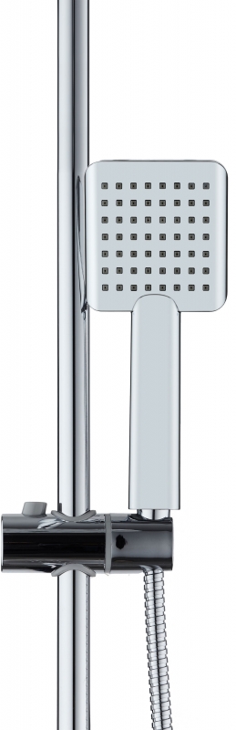 В комплекте поставки: верхний душ, смеситель, ручная лейка, шланг, держатель, мыльница, штанга.