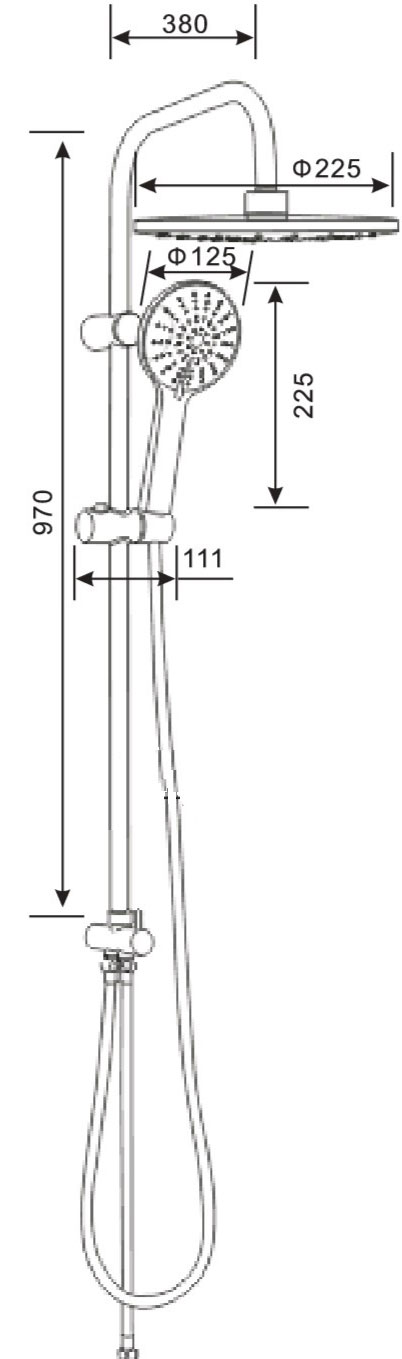 - Диаметр верхнего душа: 225 мм.