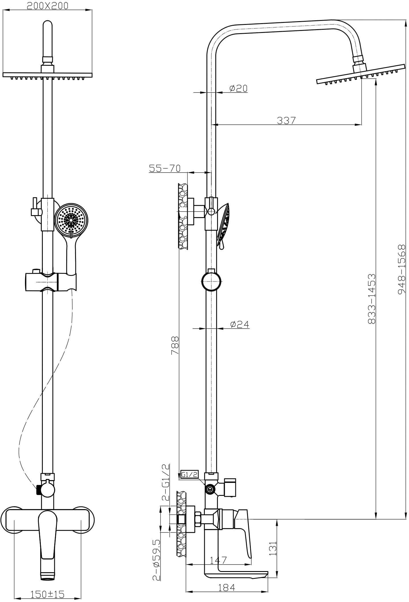 В комплекте поставки: верхний душ, ручная лейка, шланг, держатель, смеситель, штанга.