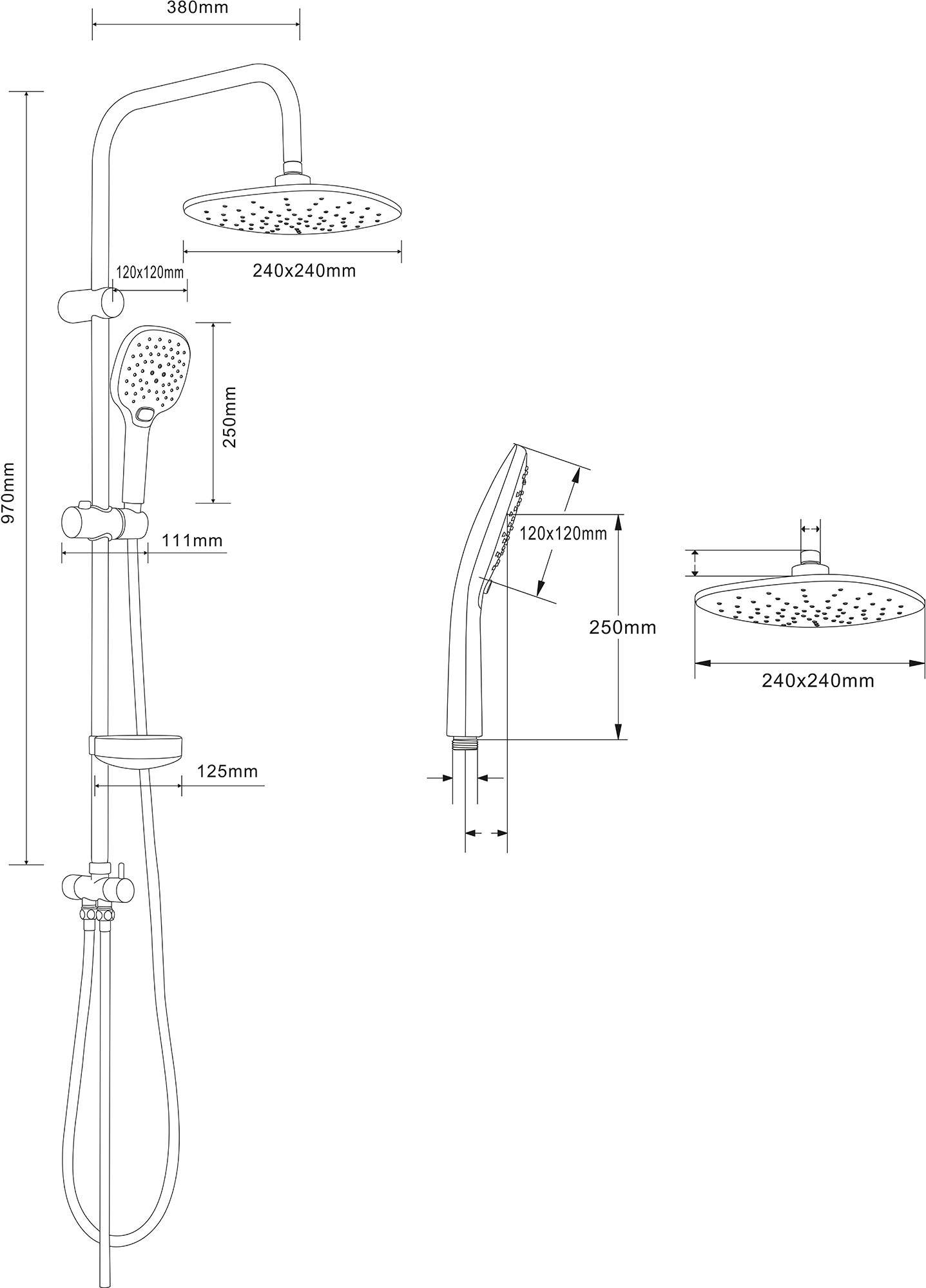 В комплекте поставки: верхний душ, ручная лейка, шланг, держатель, мыльница, штанга.