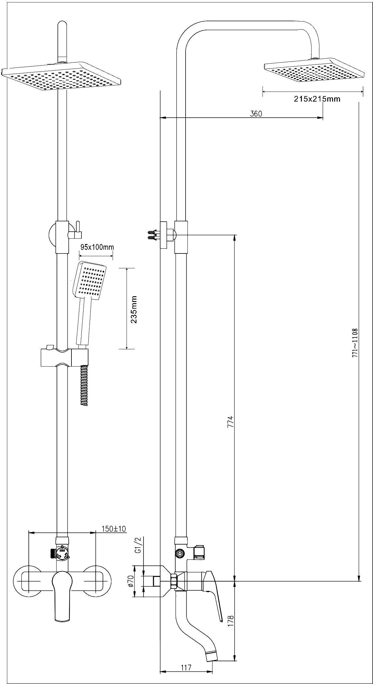В комплекте поставки: верхний душ, ручная лейка, шланг, держатель, смеситель, штанга.