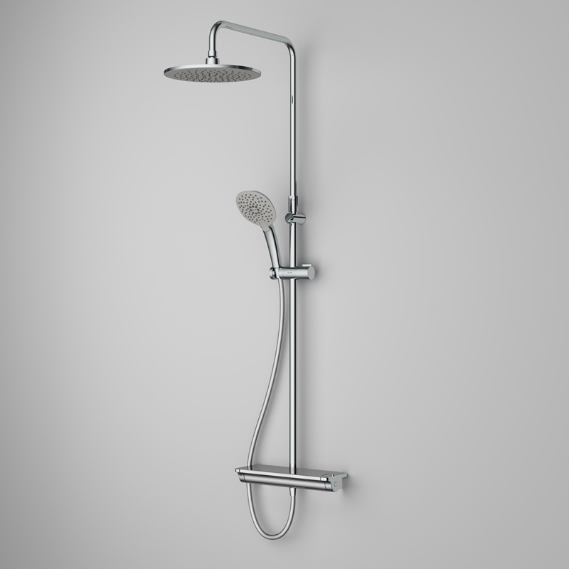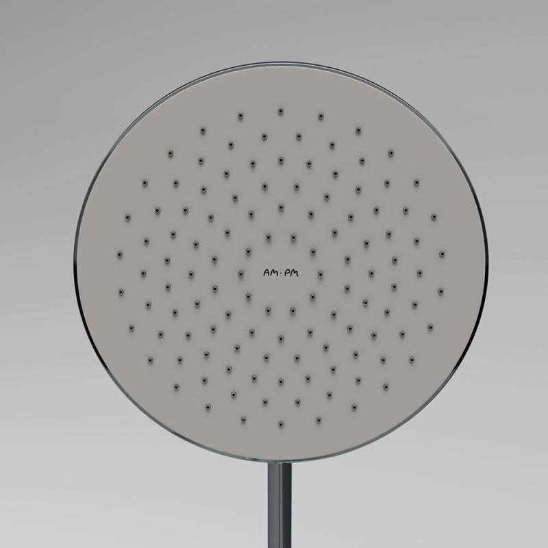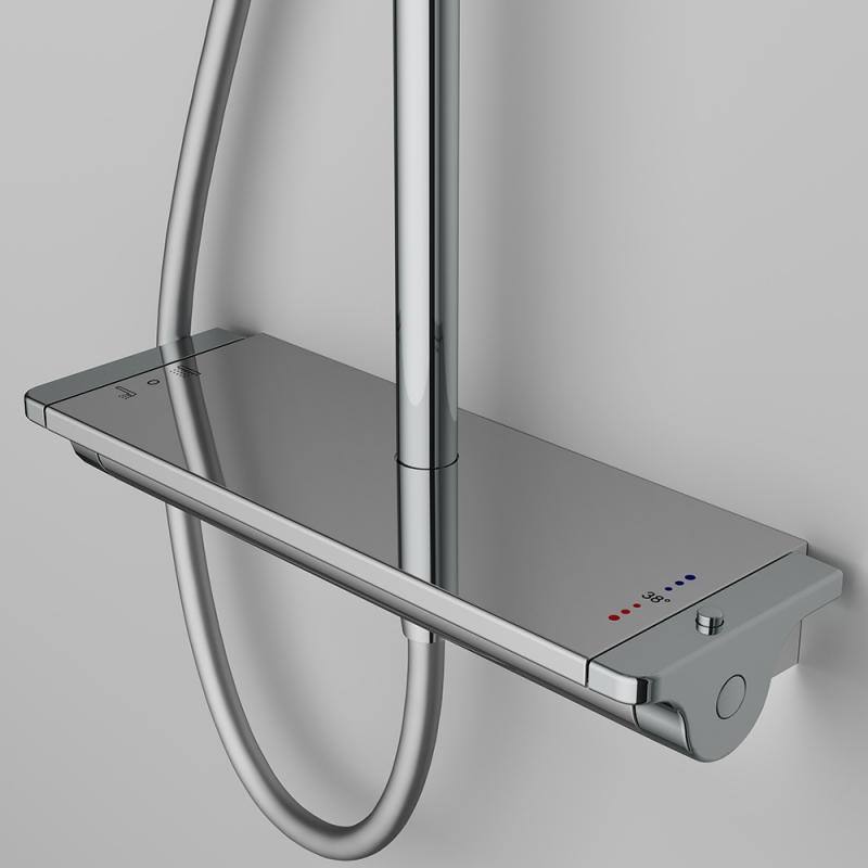 Душевая система AM.PM Spirit V2.0 F0770A400. В его основу входит телескопическая штанга с верхним душем, и возможностью крепления ручного душа. Крепление ручного душа регулируется по высоте. Лейка ручного душа имеет 3 режима работы: Spray, EnerJet, Spray + Massage. Внизу штанги расположилась удлиненная полочка-термостат. Устройство может выполнять роль как подставки для аксессуаров для душа, так и свое прямое назначение - нагрев воды.