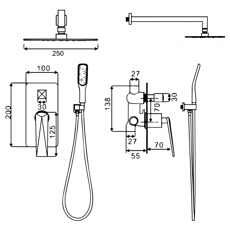 - Размеры верхнего душа (ШхД): 250х250 мм.