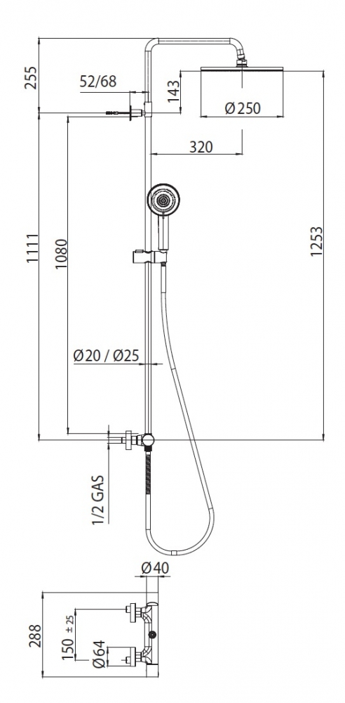 - Верхний тропический душ круглой формы. Размер: 25x25 см.