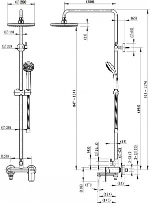 Душевая система Bravat Waterfall F6125183CP-A3-RUS со смесителем для ванны. Поворотный излив. Картридж Kerox. Аэратор Neoperl. Верхний душ 25 см ABS-пластик хром. Ручной душ 11 см, 1 режим. Шланг 1,5 м PVC. Штанга из латуни, диаметром 2,2 см.