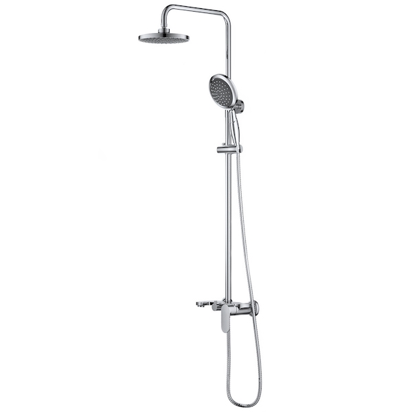 Душевая система: Душевая штанга, верхний душ, душевая лейка, душевой шланг, смеситель, держатель для душевой лейки, эксцентрик, инструкция.