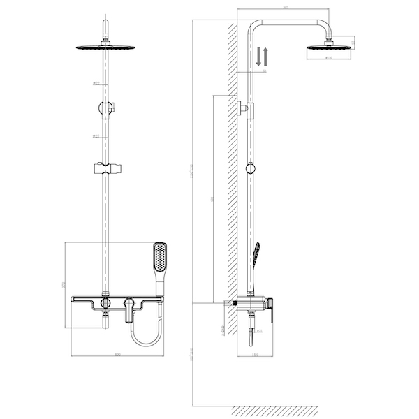 Душевая система: Душевая штанга, верхний душ, душевая лейка, душевой шланг, смеситель, держатель для душевой лейки, эксцентрик - 2 шт, инструкция.