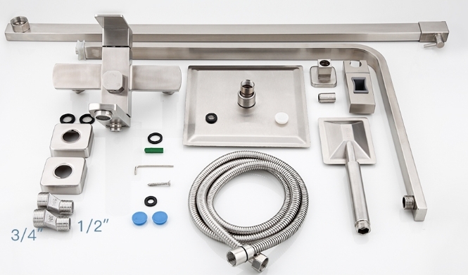 В комплекте поставки: душевая система, лейка, шланг, эксцентрики, отражатели.