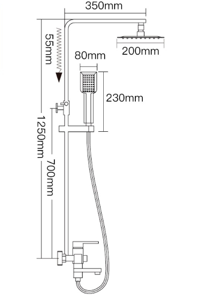 - Верхний душ размером 20х20 см. Тип струи: тропический дождь.