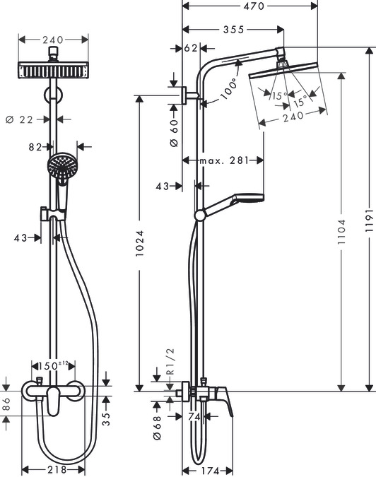 - Регулируемый угол наклона верхнего душа.