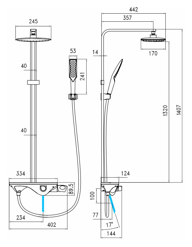 - Верхний душ: регулировка угла наклона, прямоугольный, 24,5x17 см.