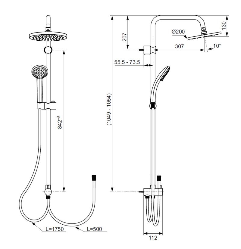 - Душевая стойка с верхним и ручным душем, два шланга, набор креплений.