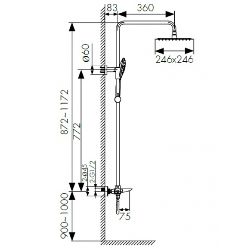 - Душевая штанга из высокачественной латуни. Регулируется по высоте от 87,2 до 117,2 см.