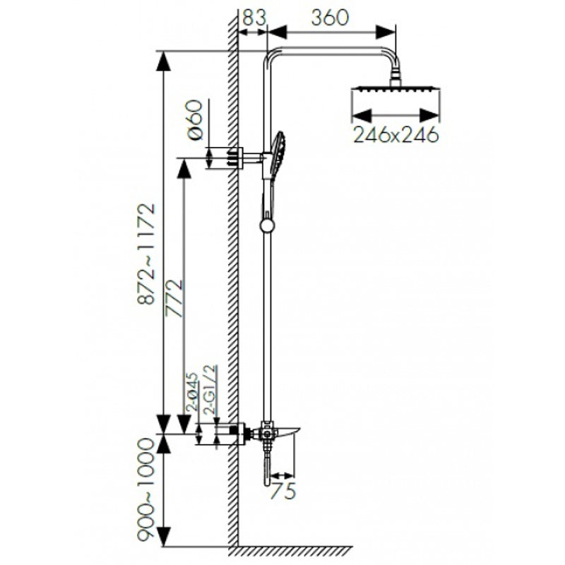 - Верхний душ квадратной формы 24,6х24,6 см.