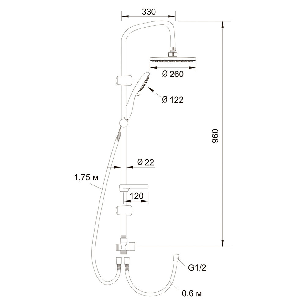 - Диаметр верхнего душа: 260 мм.