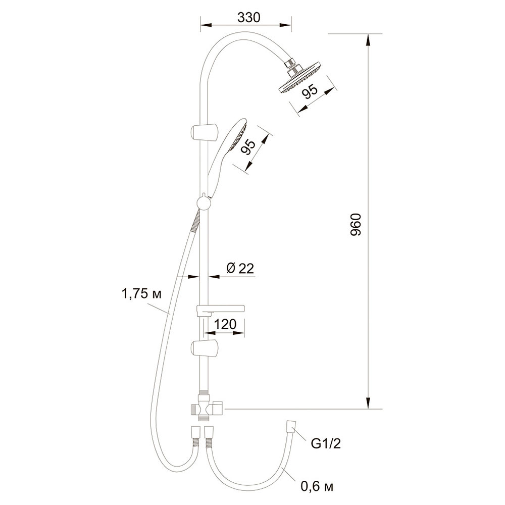- Габариты верхнего душа (ШхД): 95 х 95 мм.
