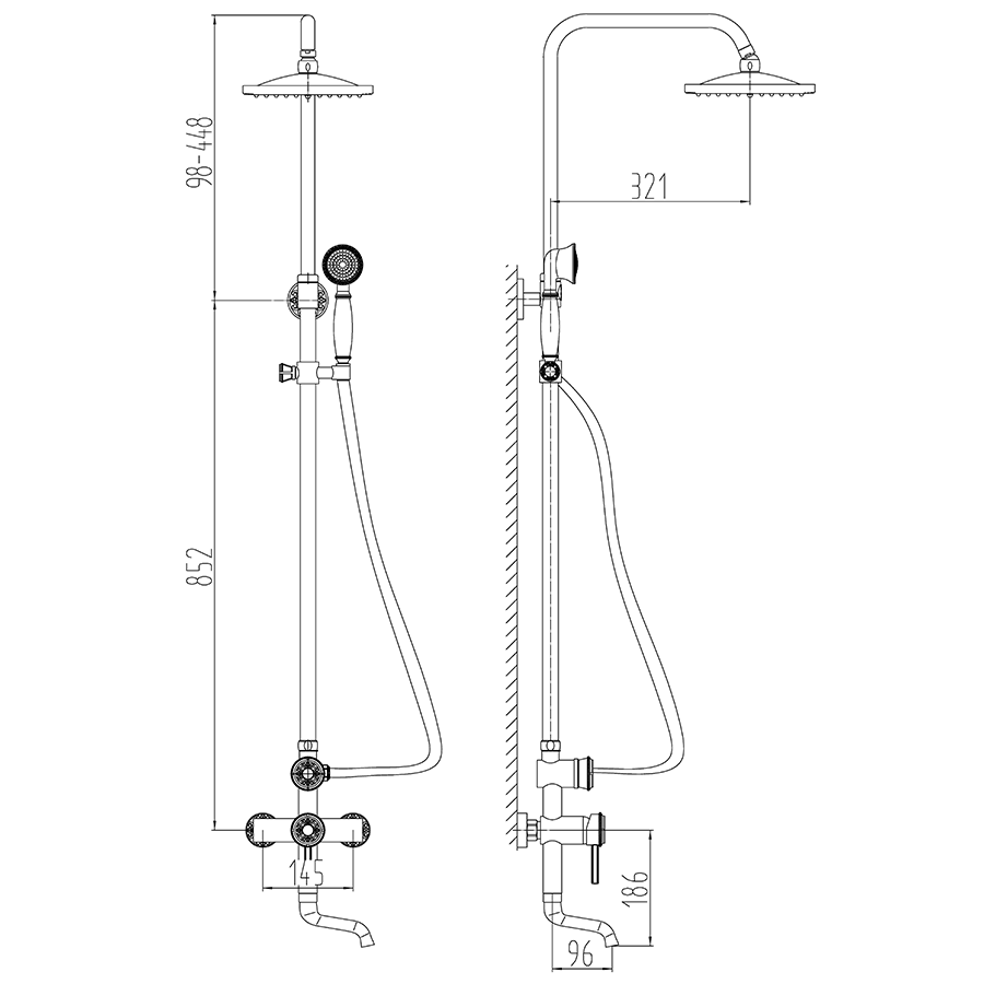 В комплекте поставки: смеситель 1 шт, крепежный комплект (эксцентрик 2 шт, отражатель смесителя 2 шт, отражатель душевой штанги 1 шт), душевая штанга (нижняя) с держателем ручной лейки 1 шт, душевая штанга верхняя 1 шт, верхний душ 1 шт, ручная лейка 1 шт, душевой шланг 1 шт, тройник с выходом под душевой шланг 1 шт, паспорт/гарантийный талон 1 шт.