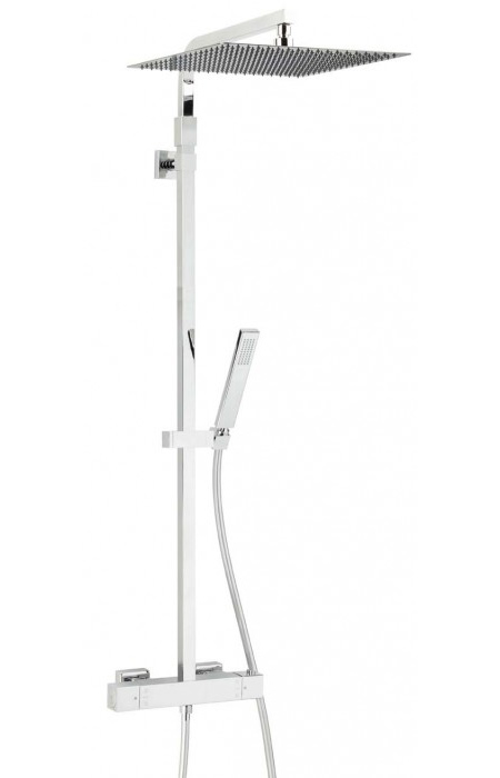 Душевая стойка Valentin Touareg Dome. Цвет хром. В комплекте поставки: эксклюзивный экстра плоский верхний душ D 400 мм, ручной душ, гибкий силиконовый шланг 1,75 м, душевая штанга из нержавеющей стали с закрепляющимися мыльницами, термостатический смеситель NF. Блокируемая температура +38С. Регулируемый по высоте.