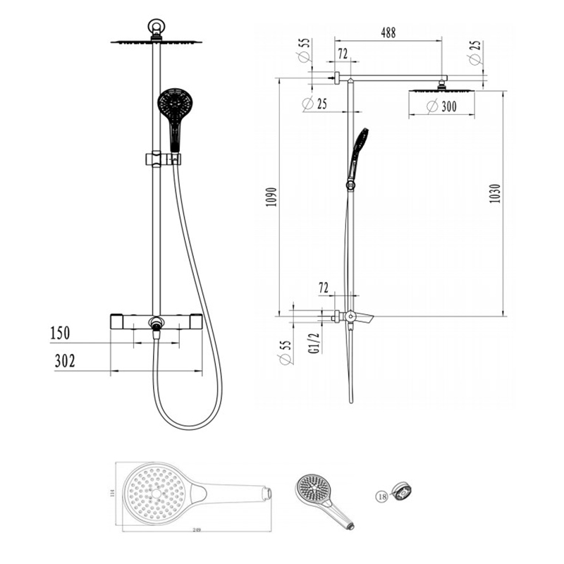 Верхний душ: тропический дождь. Длина кронштейна 48.8 см. Тонкий круглый диск. Размер: 30 х 30 см.