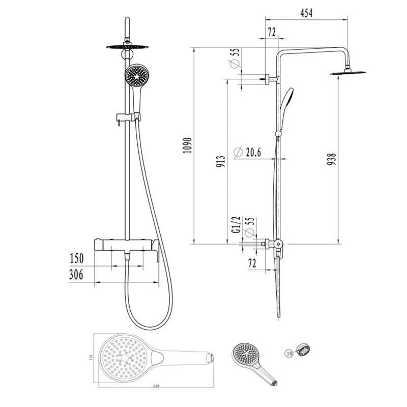Верхний душ: тропический дождь. Длина кронштейна 45,4 см. Тонкий круглый диск. Размер: 20 х 20 см.