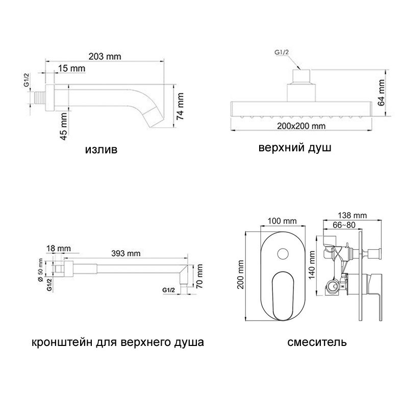 В комплекте поставки: верхний душ, кронштейн для верхнего душа, излив, смеситель (внешняя и внутренняя части).