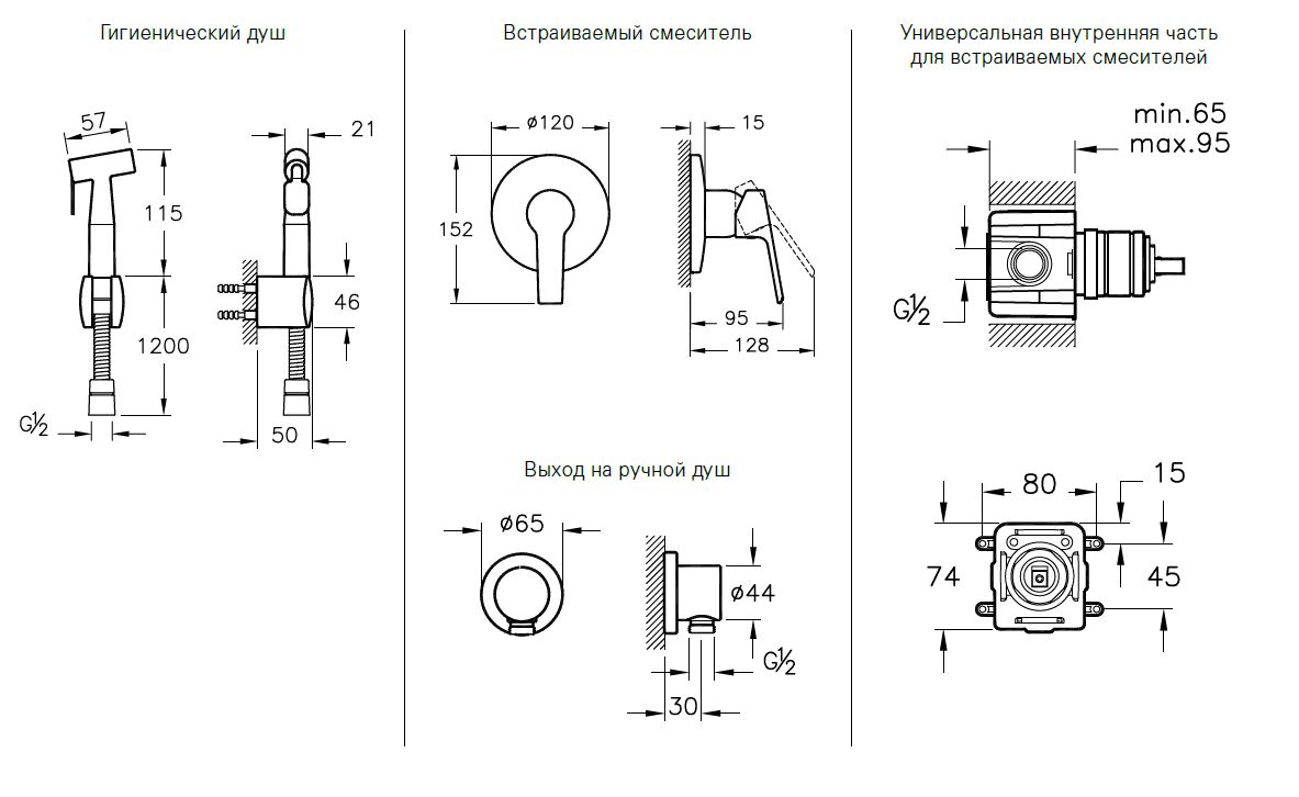 В комплекте поставки: смеситель (внешняя и внутренняя части), гигиенический душ, держатель.