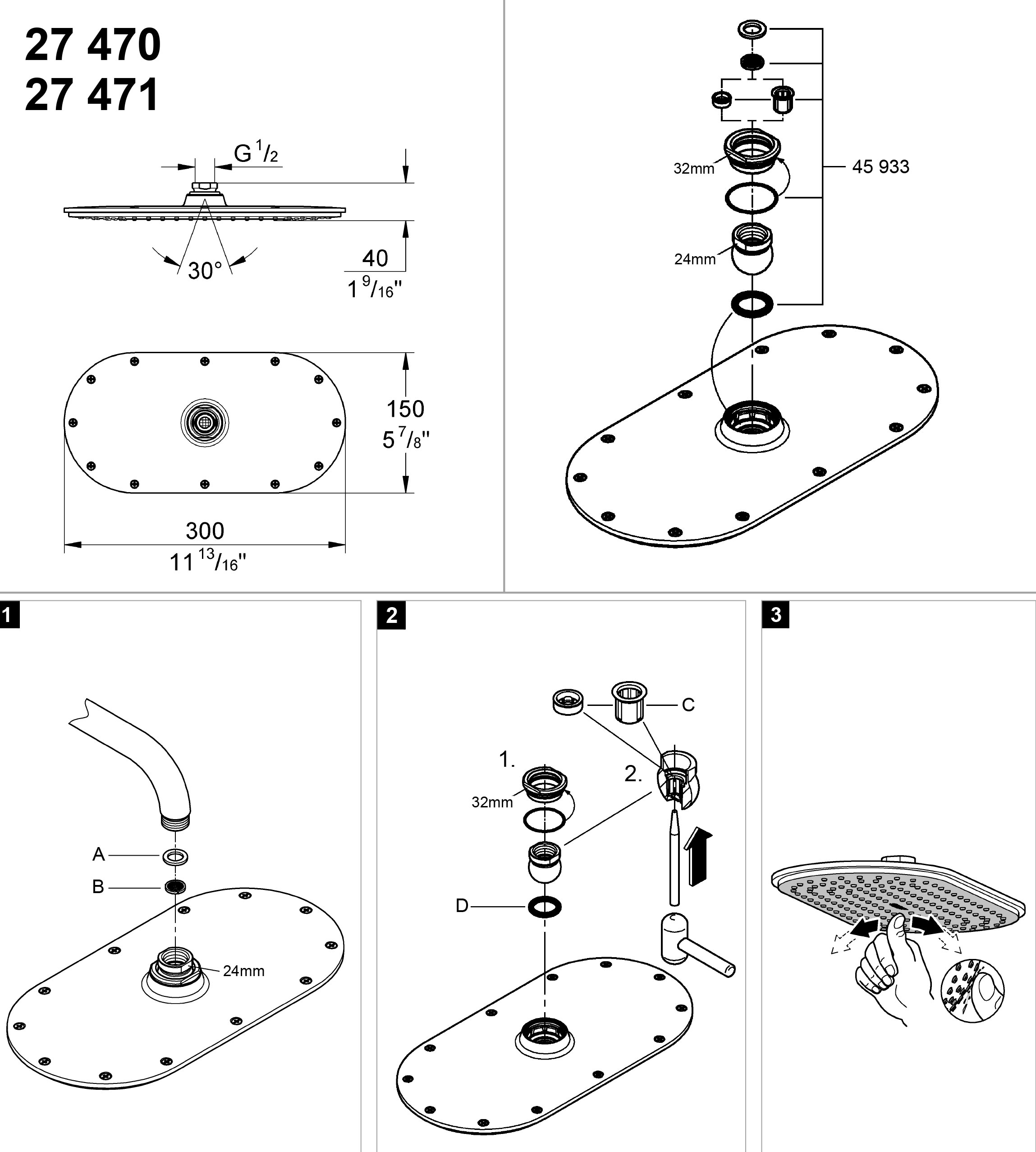 Grohe Rainshower Cosmopolitan 27471000 верхний душ. На один вид струи. Диаметр душевой лейки 180 мм, излив поворотный 50°. Монтаж настенный.