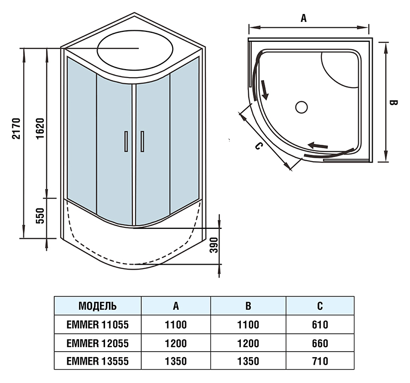 - Поддон: акриловый, высотой 55 см, с сиденьем, со съемным экраном.