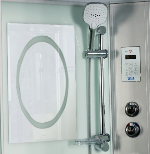Стеклянный душевой бокс WeltWasser WW500 Emmer 13555 135x135 в форме четверти круга, с крышей, со встроенным сиденьем, с двумя раздвижными дверьми. Гидромассаж спины. Сенсорное управление. Термостатический смеситель. Верхний свет LED. Безсиликоновая сборка.