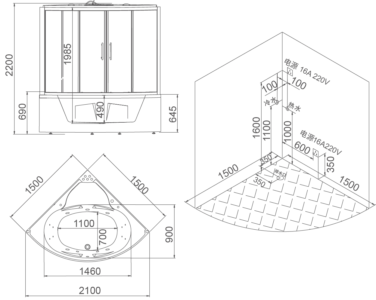 - Габариты (ДхШхВ): 150х150х220 см,
