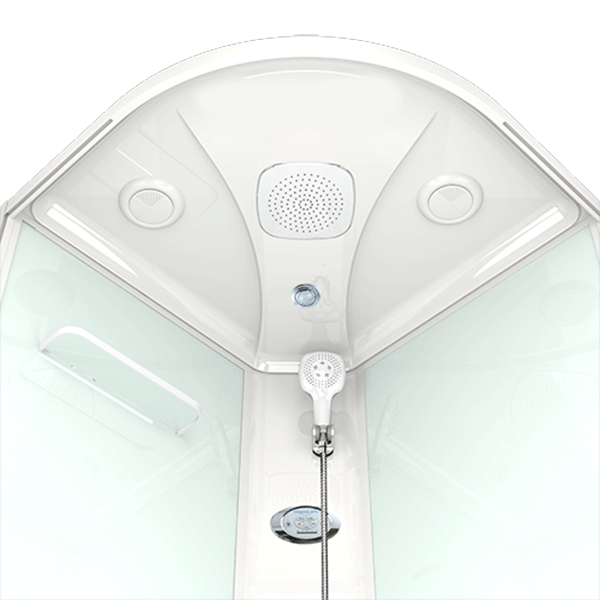 Стеклянная душевая кабина Domani-Spa Delight 99 High 90x90 DS01D99HWCl10 с двумя раздвижными дверьми, гидромассажем, с крышей, в форме четверти круга, для установки в угол ванной комнаты.