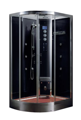 Пародушевая кабина Grande Home WS103L/S6/BB гидромассажная с черными задними стенками из стекла толщиной 8 мм. Левое исполнение. Комплектация: термостатический смеситель, верхний душ, система хромотерапии, FM-радио, возможность подключения к MP3, турецкая баня, съемный панели для быстрого технического доступа, функция самоочистки парогенератора, ручная душевая лейка со штангой, переключатель потоков, гидромассажные форсунки, паровая форсунка с фитоконтейнером, отделка крыши из акрила, складное сиденье и решетка поддона из тонированного дуба.