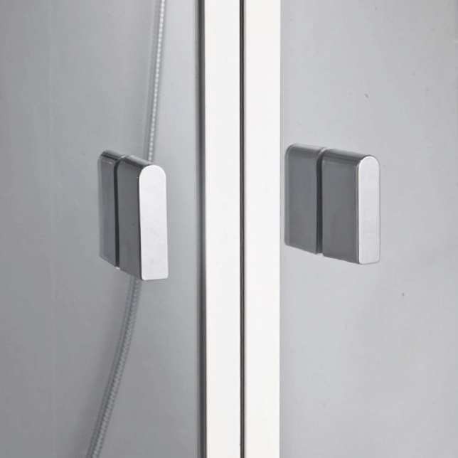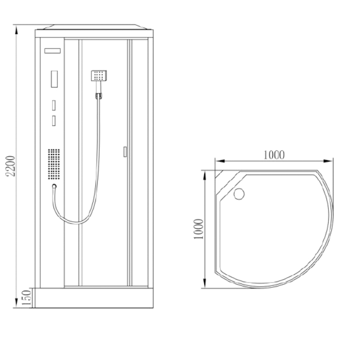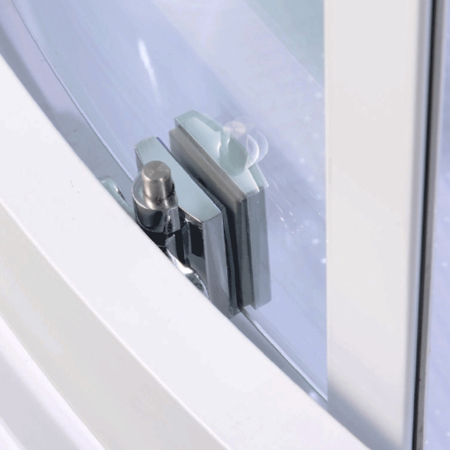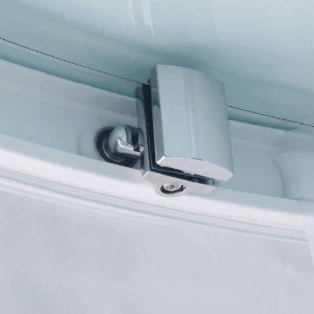 - Современная угловая форма кабины четверть круга с системой раздвижных дверей.