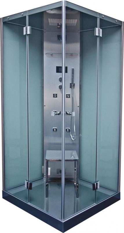 Victory Spa Karl 100x100 душевая кабина. Система 1 включает в себя: ручное управление гидромассажем, трёхпозиционный термостатический смеситель, хромотерапию. Дополнительно можно приобрести радио FM со стандартными динамиками или с динамиками SFH Gel Audio, стальное сидение с отделкой Тик или полистерол, хрустальные ручки.
