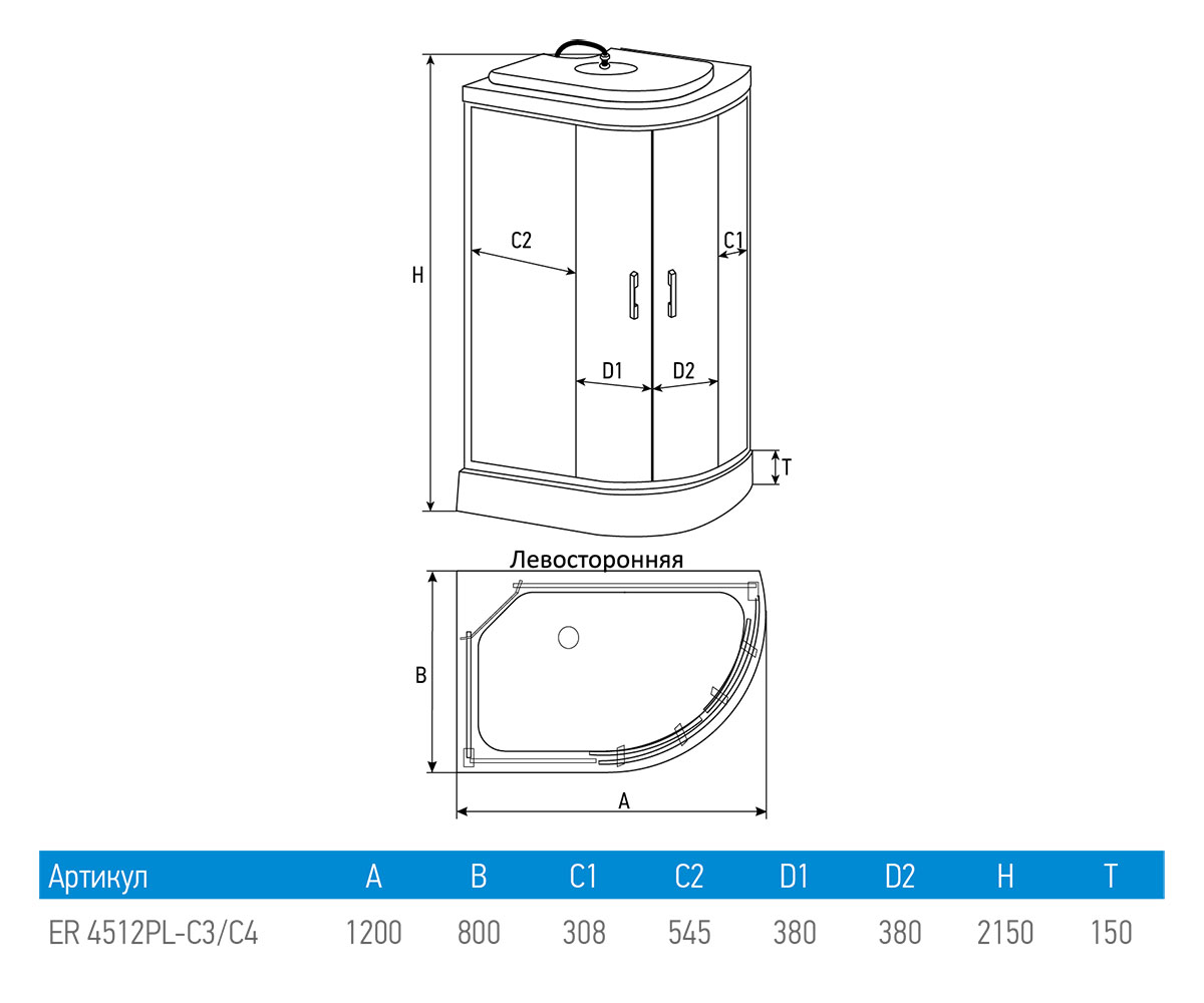 Функциональная душевая кабина Erlit Comfort имеет асимметричную форму. Для комфортного использования внутри кабины зеркало, радио, вентиляция и полочка.