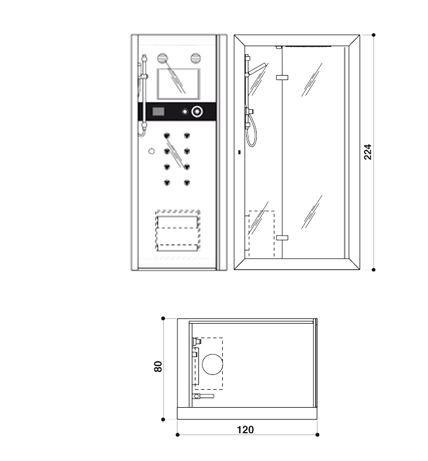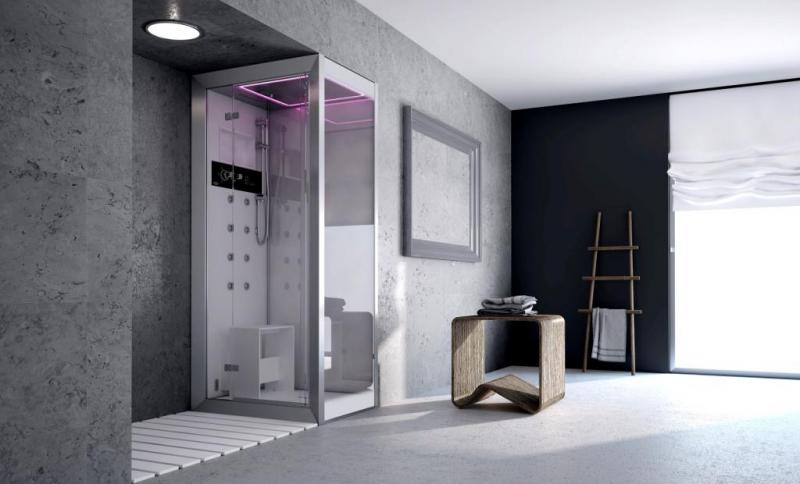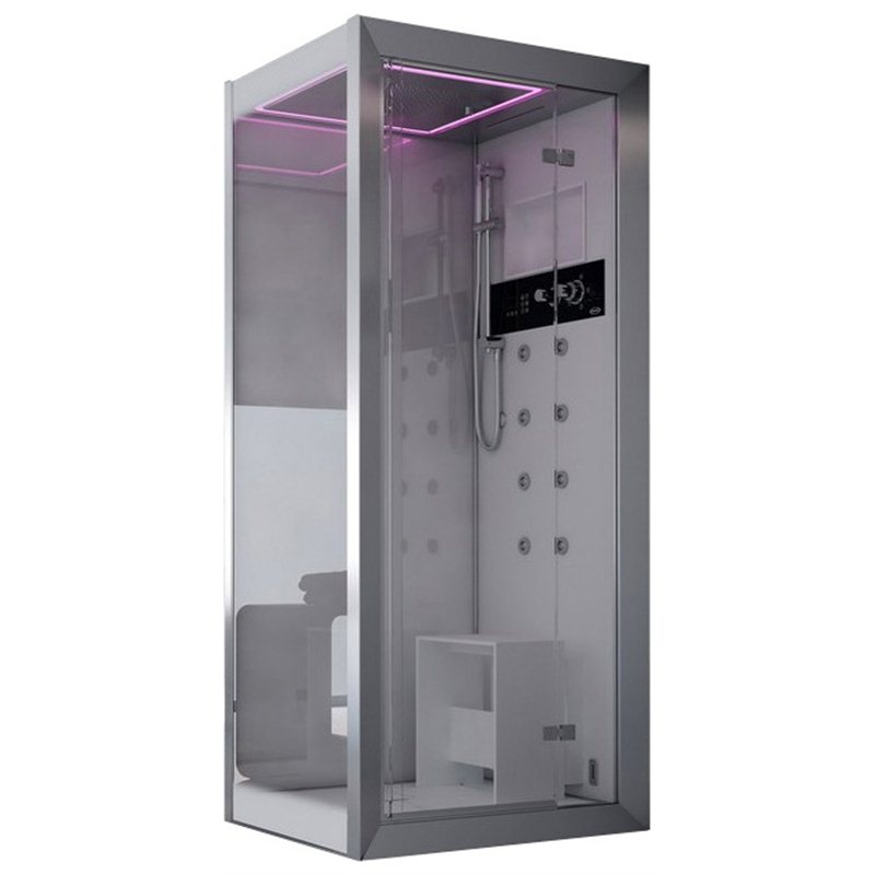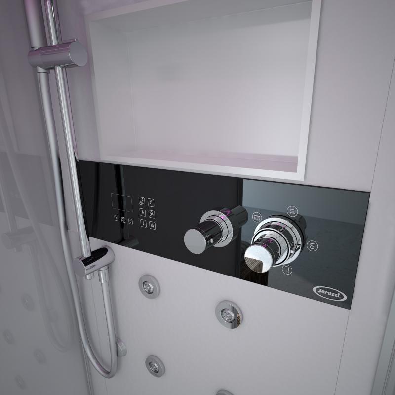 Душевая кабина Jacuzzi Frame 120 Top с турецкой баней и гидромассажем. Последовательный гидромассаж – 8 форсунки, массаж шеи – 4 форсунки, поясничный гидромассаж – 4 форсунки, массаж ши-а-цу – 8 форсунок. Функции душевой кабины: душ с водопадом, разбрызгиватель с эффектом дождя, термостатический смеситель, ароматерапия, сиденье и функциональные полочки.