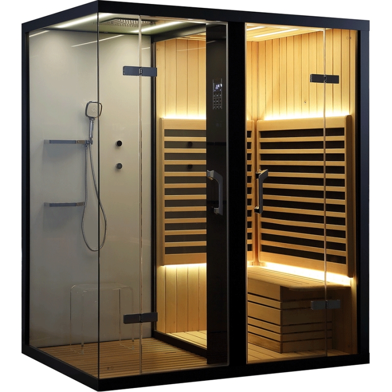 - Комбинированная паровая и инфракрасная кабина, черный профиль, задние белые стекла, в отделке сауны применен канадский кедр.