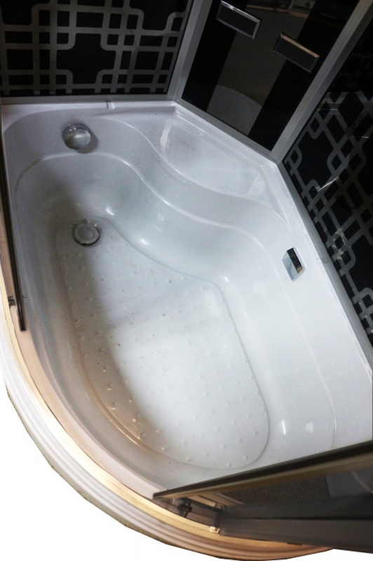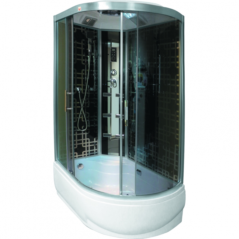 тропический (верхний) душ, пульт Touch-Screen Blaсk с Радио, верхний душ, LED подсветка, вентилятор, динамик, двойная полка, ручная лейка с душевой штангой, гидромассаж спины, задние стекла черные с зеркальным рисунком, полированные профиля,тонированные стекла 5 мм, двойные ручки, двойные ролики, широкие водоотсекатели,алюминиевые-полированные магнитные уплотнители, слив-перелив.